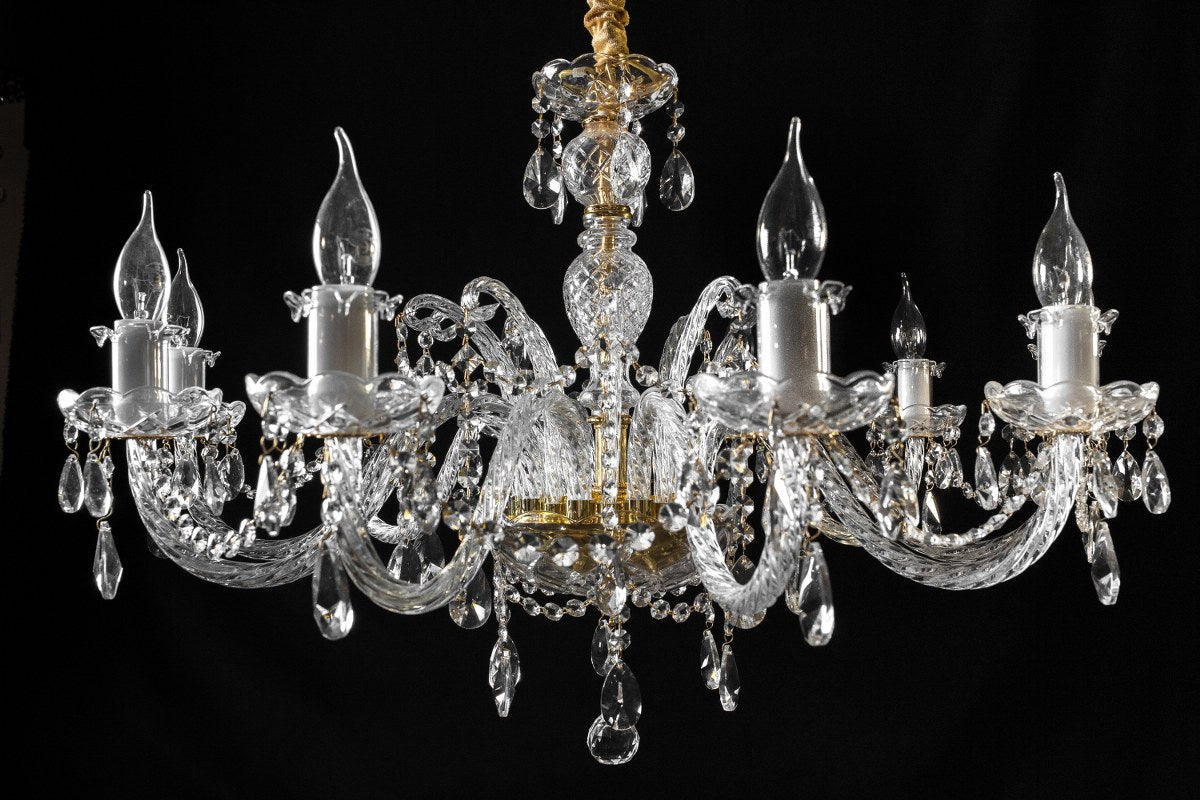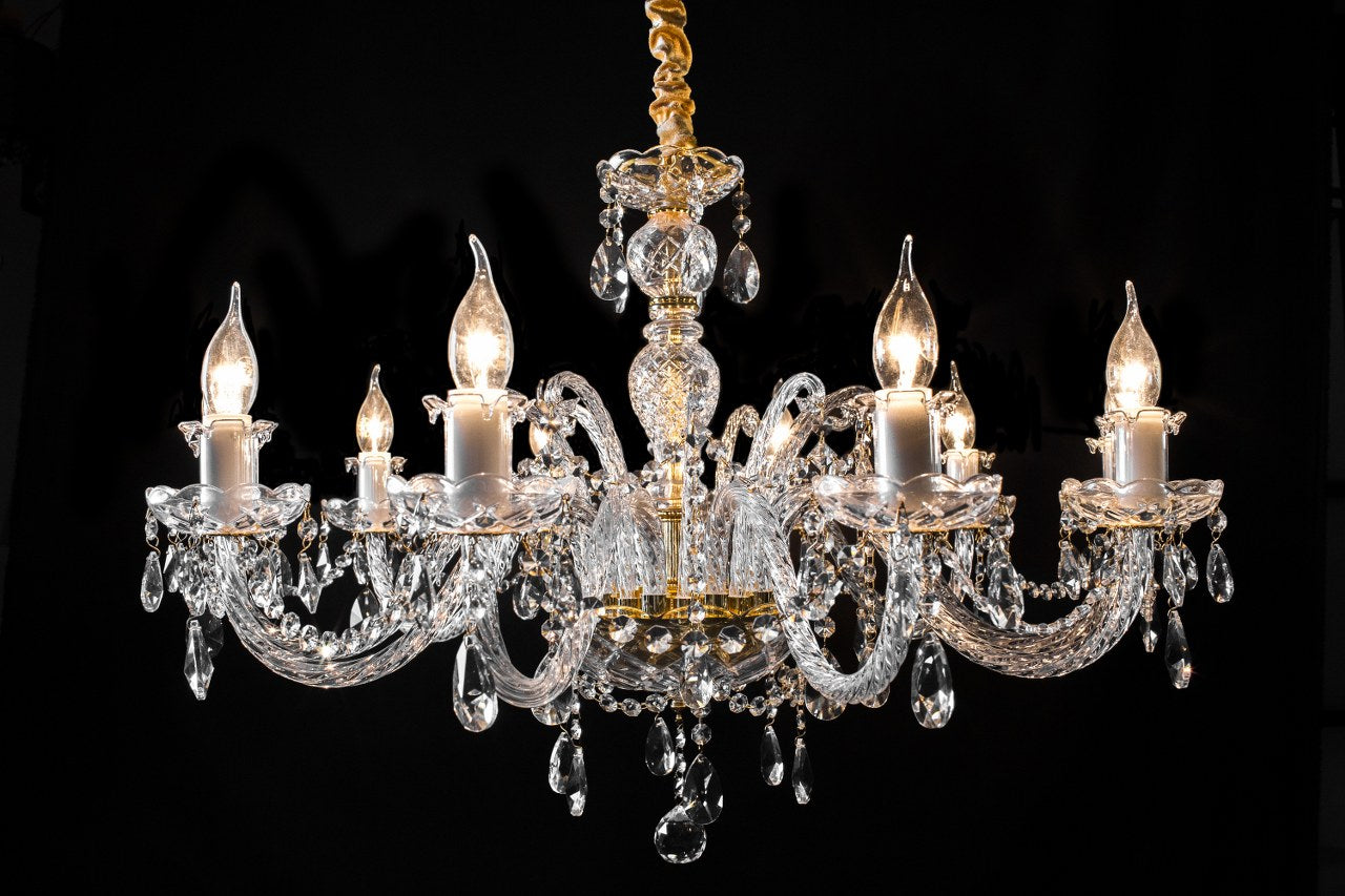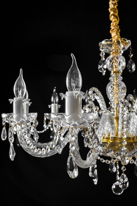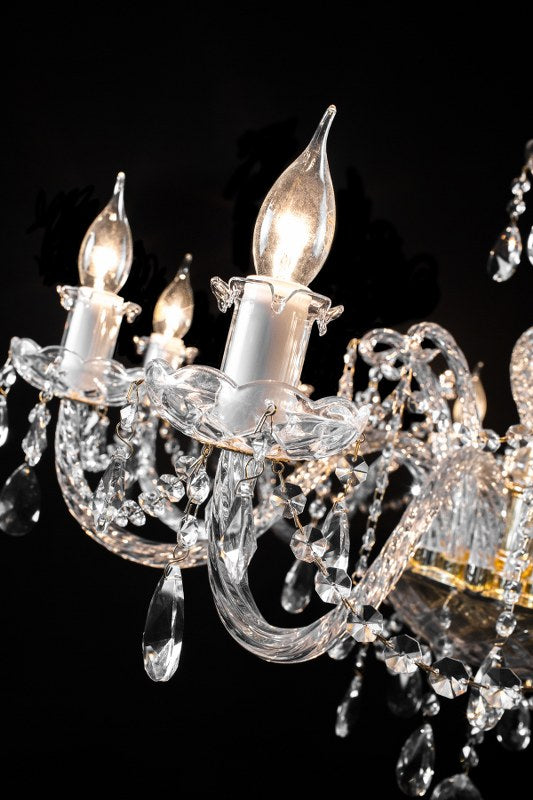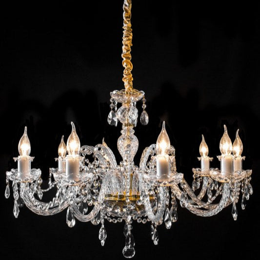 Lujoso candelabro de cristal con estructura dorada y diez brazos con portalámparas estilo vela. Decorado con finas gotas de cristal que reflejan la luz, ideal para espacios elegantes.